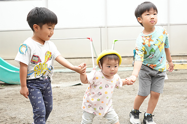 また、ハンデのある子もない子も自ら遊びを考え出して一緒に遊んでいます。 異年齢の関わりや統合保育を通じ、私達つぼみ保育園の職員は、子供達の主体性や情緒の成長発達を大事に見守り助言し、支え、誉め、時には叱ります。 集団保育の場で子供同士がお互いを認め合い、高めあうことができる保育環境づくりを心がけています。
