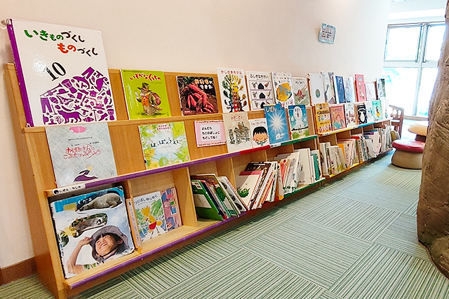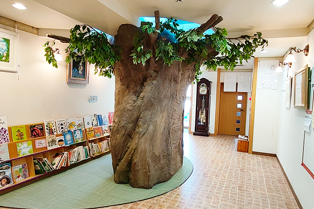 2階のエントランスホールには大きな「すずかけの木のオブジェ」と大きな「柱時計」、そしてたくさんの絵本が並んだ「本棚」があります。