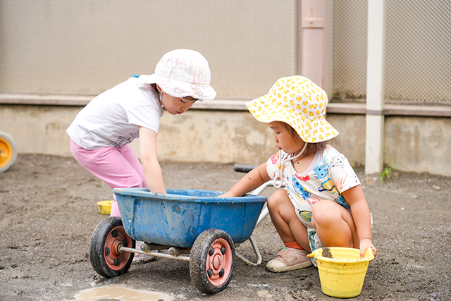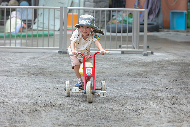 身体を動かす遊びを通して運動能力を養い、お友だちと協力して遊ぶ中で、協調性やコミュニケーション能力を育てます。また、自然の音、光、風、土の感触などによって五感が刺激され、子どもたちの感覚が豊かになります。