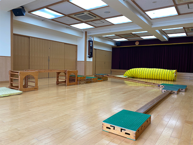 誕生会や生活発表会など様々な催しや、雨天時の遊び場、またお昼寝にも使用されている大広間「ぶどうの部屋」です。